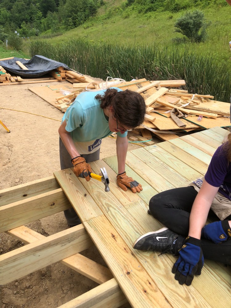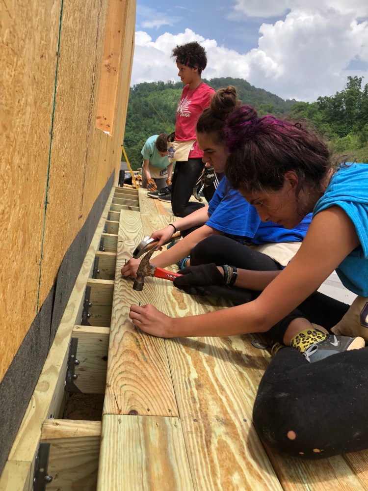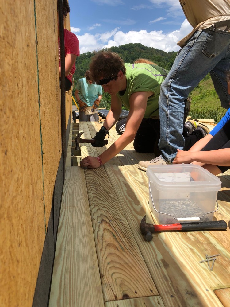 My name is Sarah Renfro, and although I have been on a lot of mission trips, this is my first time to the Housing Development Alliance in Hazard, KY. I feel like I have come a little bit home since my mom grew up not far from here. The meal we had tonight was something she had regularly growing up in Pippa Passes, KY at Alice Lloyd College, where her dad Will Hayes was the president. I have loved working with these young people, sweating alongside them, as we work on a new build. Today was so great because we finished the front porch to the home for Molly and her family, and we wrapped the outside of the house. The students work so hard and well together, and our crew motivates, teaches, and is patient with us as we learn new skills. And we got milkshakes! Hammers and nails have become our friends even as our relationship as a group has grown. I was also fortunate enough to spend time at the other site removing mortar from reclaimed concrete blocks. Tough work but necessary to make a strong foundation for an existing home. The projects we are working on this week are much more than a side project for students during the summer, but are the literal and figurative building blocks to a life of stability and hope.