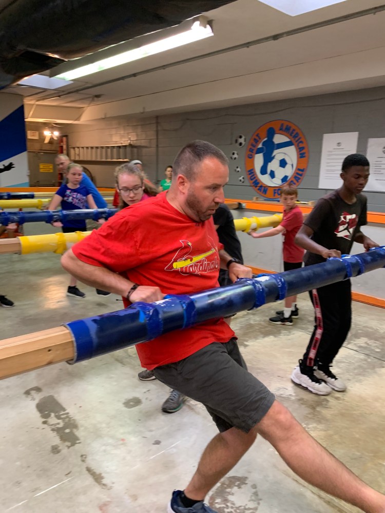 F is for foosball…we had fun playing human foosball with our new friends in the community