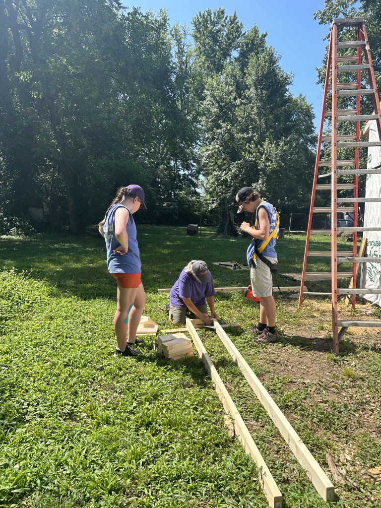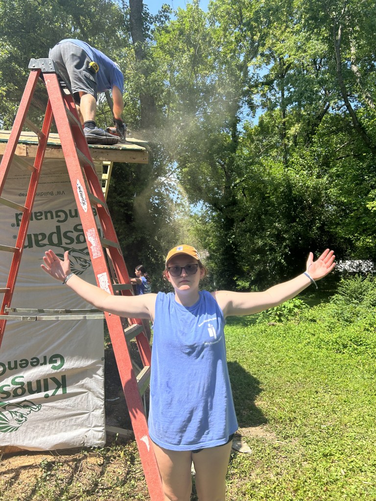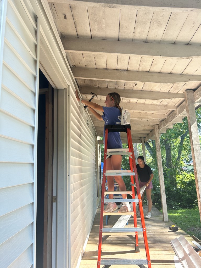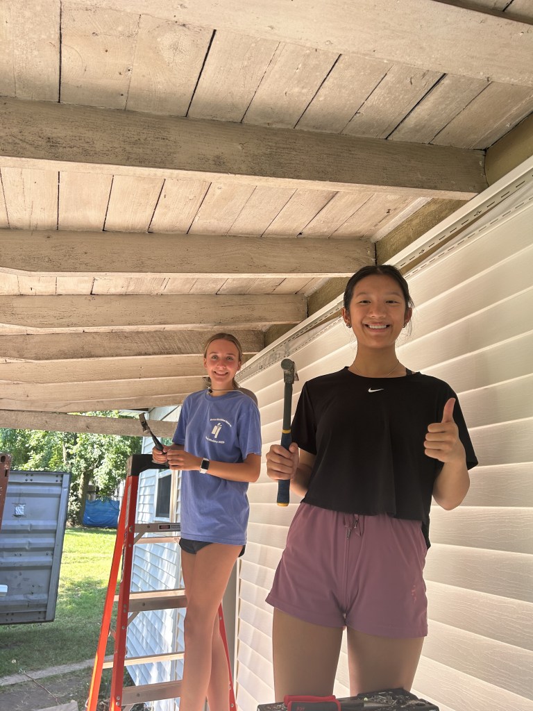 Today began with an early morning surprise, a well deserved breakfast of donuts. After a rough wake up we made our way to the home front, prepping for a long, hot day of siding and roofing. The tools were out and the sun was too. We split into two teams to complete all our tasks with half finishing a set of stairs and siding while the others worked on wrapping the shed to prep for siding, and crawling up and down ladders to quickly cover the shed for the incoming rain tonight. We broke for lunch around 12:30 and came back to the site at 1:30 after a well deserved nap. The teams began to work again and didn’t stop until 3:30 when we made our way back to the church (not without a few napping during the drive) for showers and a zoom call to discuss the impacts that disasters have in places like Mayfield. After our quick zoom we began to play a game, in which we gained a better awareness of fairness and how to achieve equality in the game and real life. To finish off the night we had pasta and salad for dinner, a delish meal complete with lots of laughter and fun. To round out our wonderful day we settled in the main room to watch Teen Beach Movie, singing all the songs and laughing through it all.