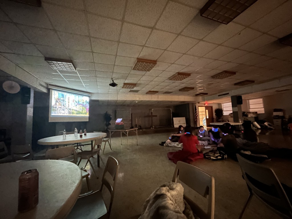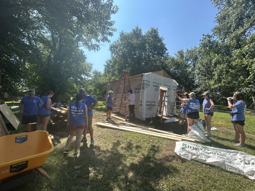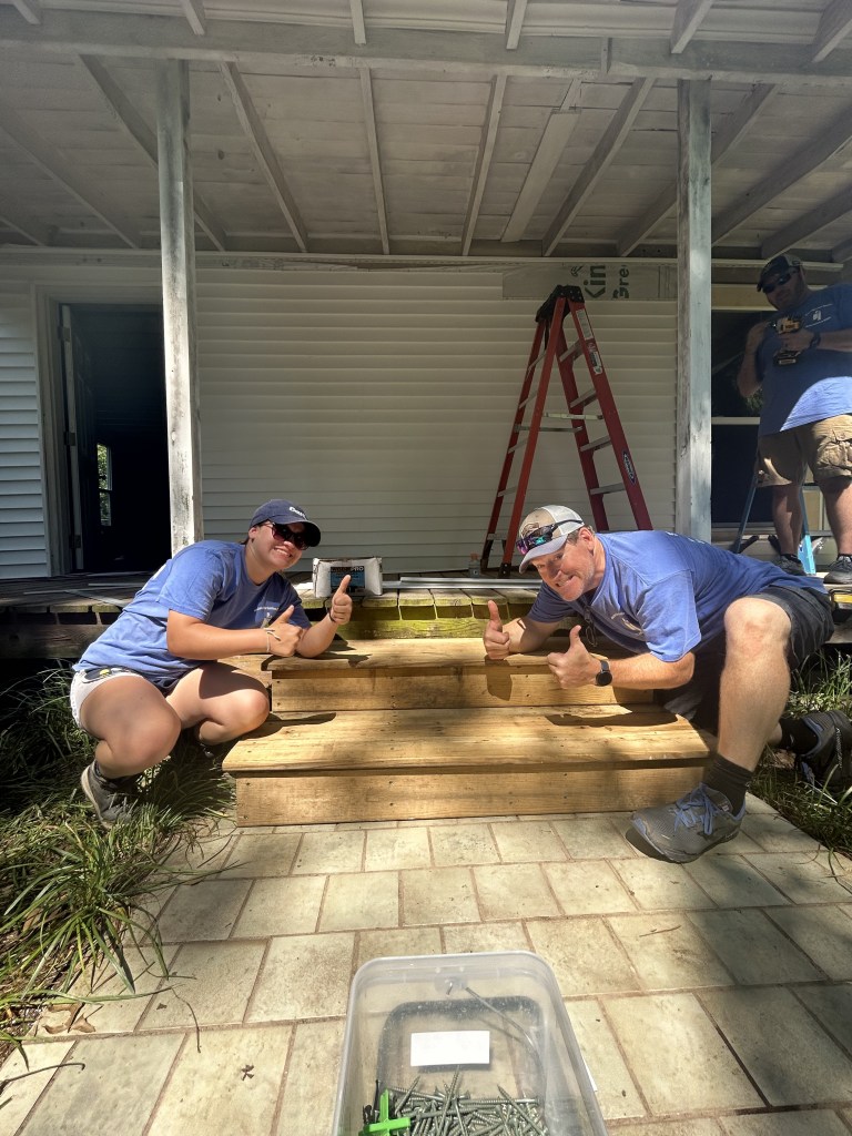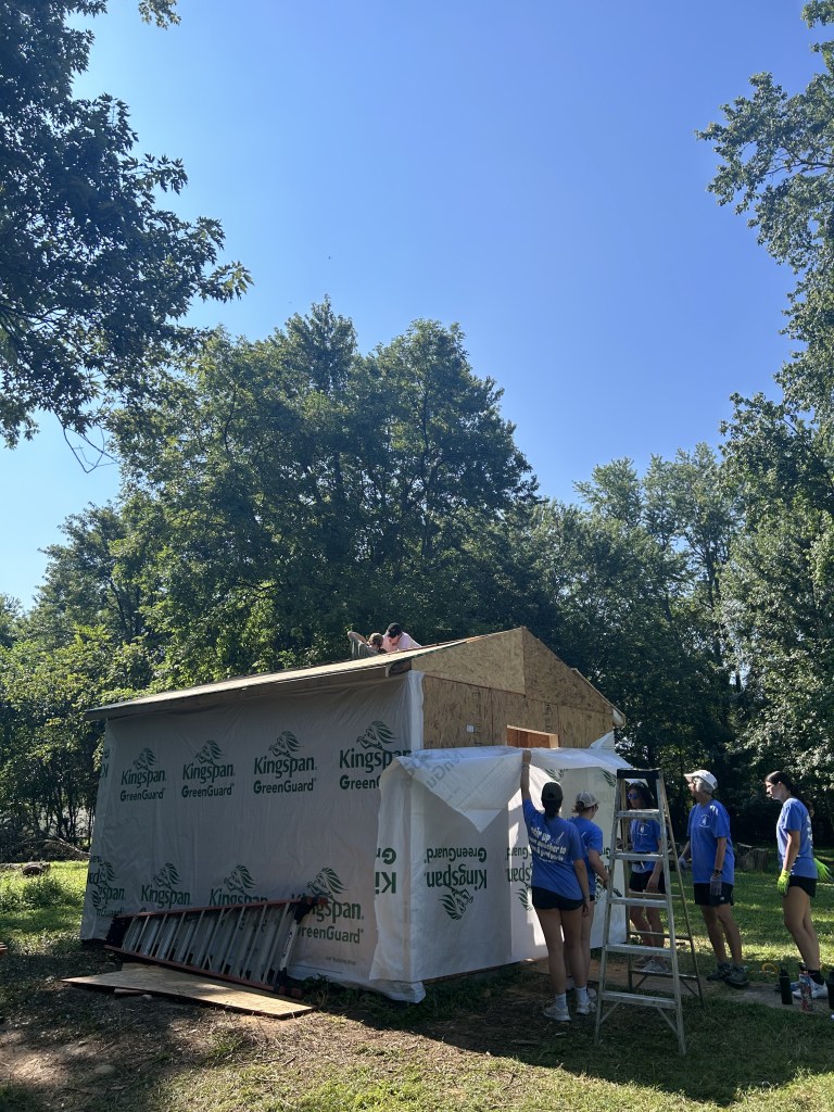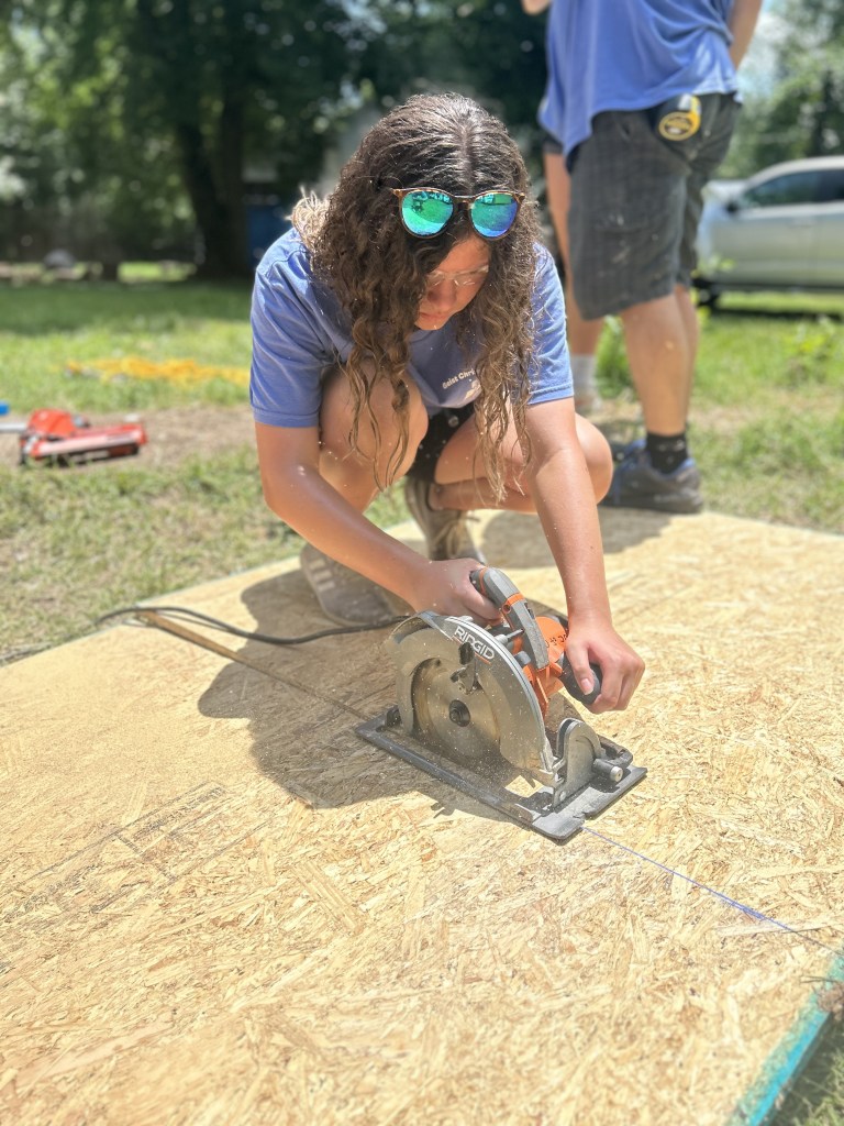 Today began with an early morning surprise, a well deserved breakfast of donuts. After a rough wake up we made our way to the home front, prepping for a long, hot day of siding and roofing. The tools were out and the sun was too. We split into two teams to complete all our tasks with half finishing a set of stairs and siding while the others worked on wrapping the shed to prep for siding, and crawling up and down ladders to quickly cover the shed for the incoming rain tonight. We broke for lunch around 12:30 and came back to the site at 1:30 after a well deserved nap. The teams began to work again and didn’t stop until 3:30 when we made our way back to the church (not without a few napping during the drive) for showers and a zoom call to discuss the impacts that disasters have in places like Mayfield. After our quick zoom we began to play a game, in which we gained a better awareness of fairness and how to achieve equality in the game and real life. To finish off the night we had pasta and salad for dinner, a delish meal complete with lots of laughter and fun. To round out our wonderful day we settled in the main room to watch Teen Beach Movie, singing all the songs and laughing through it all.