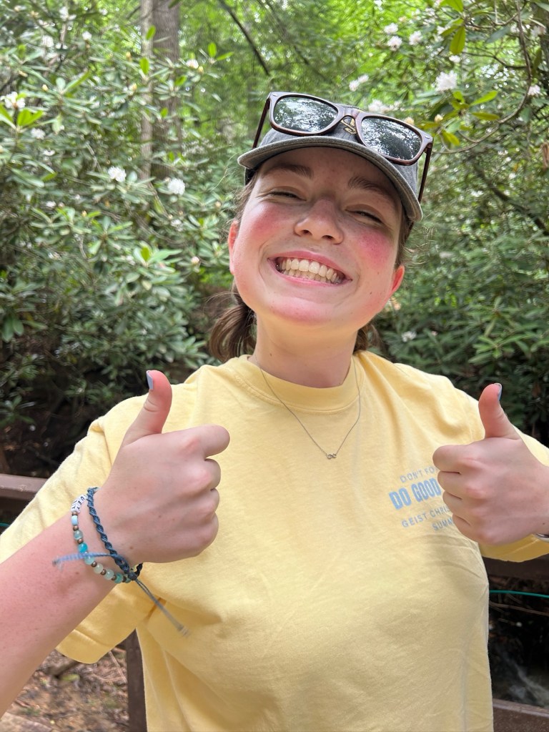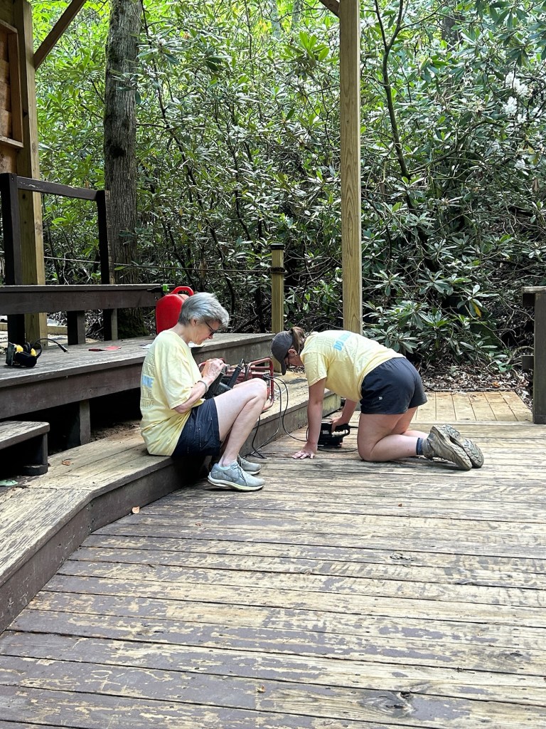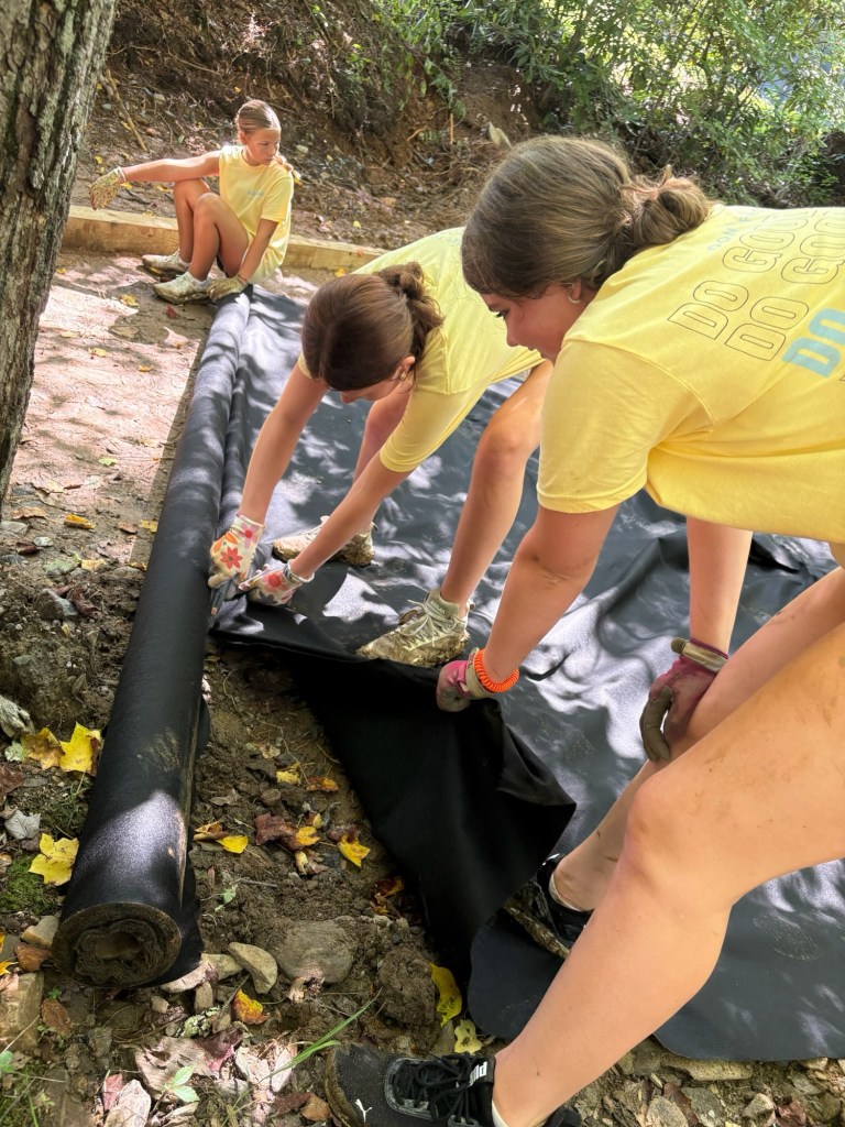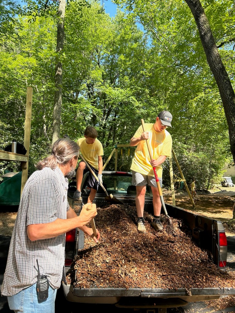 Today we worked on the playground. Some people split into groups and focused on different areas. One group worked on moving mulch, while the other worked on staining a deck. The mulch group began by clearing the ground of remaining roots and rocks. To prepare for the mulch, they laid down a tarp and then started spreading the mulch on top of it.