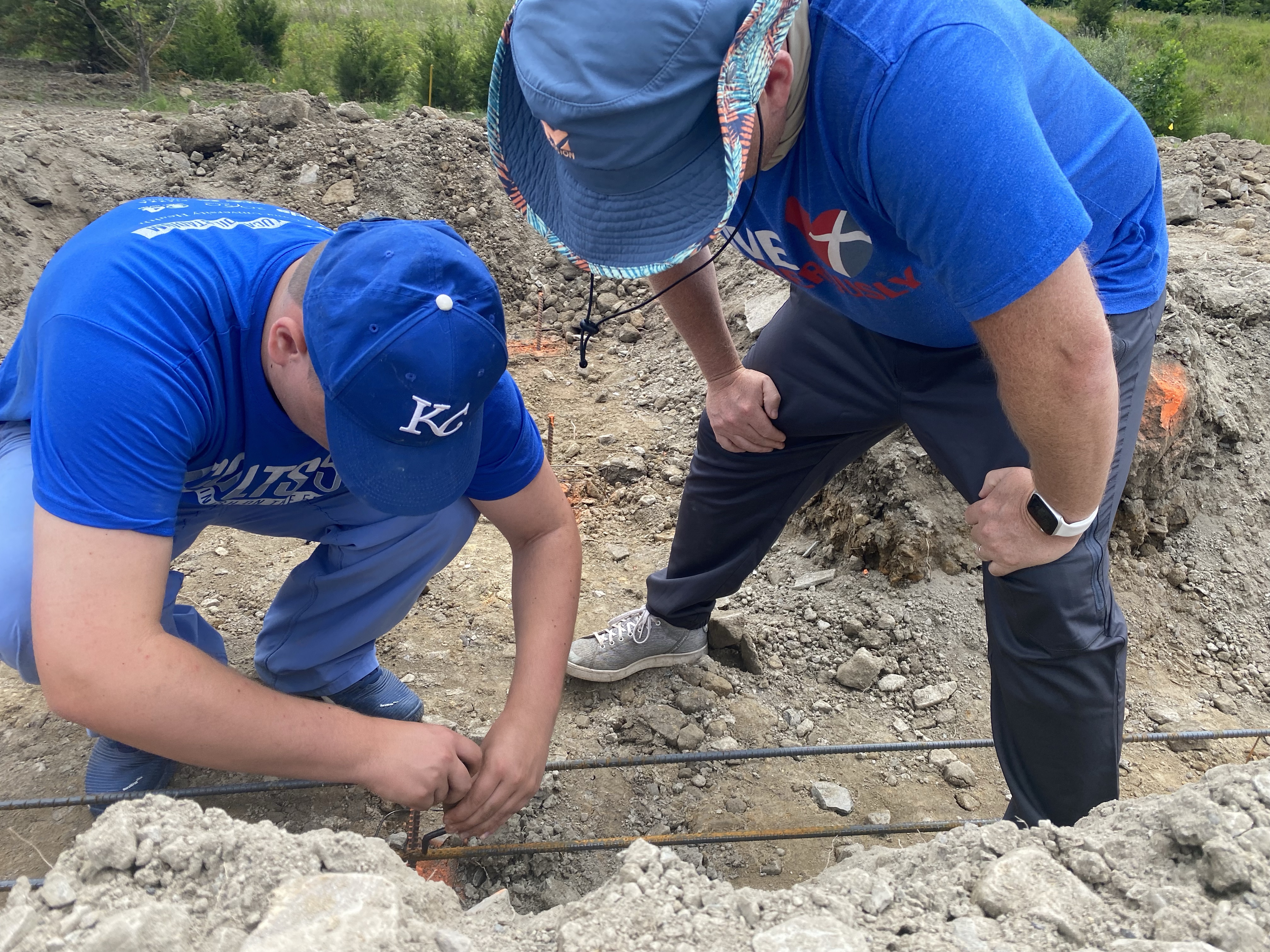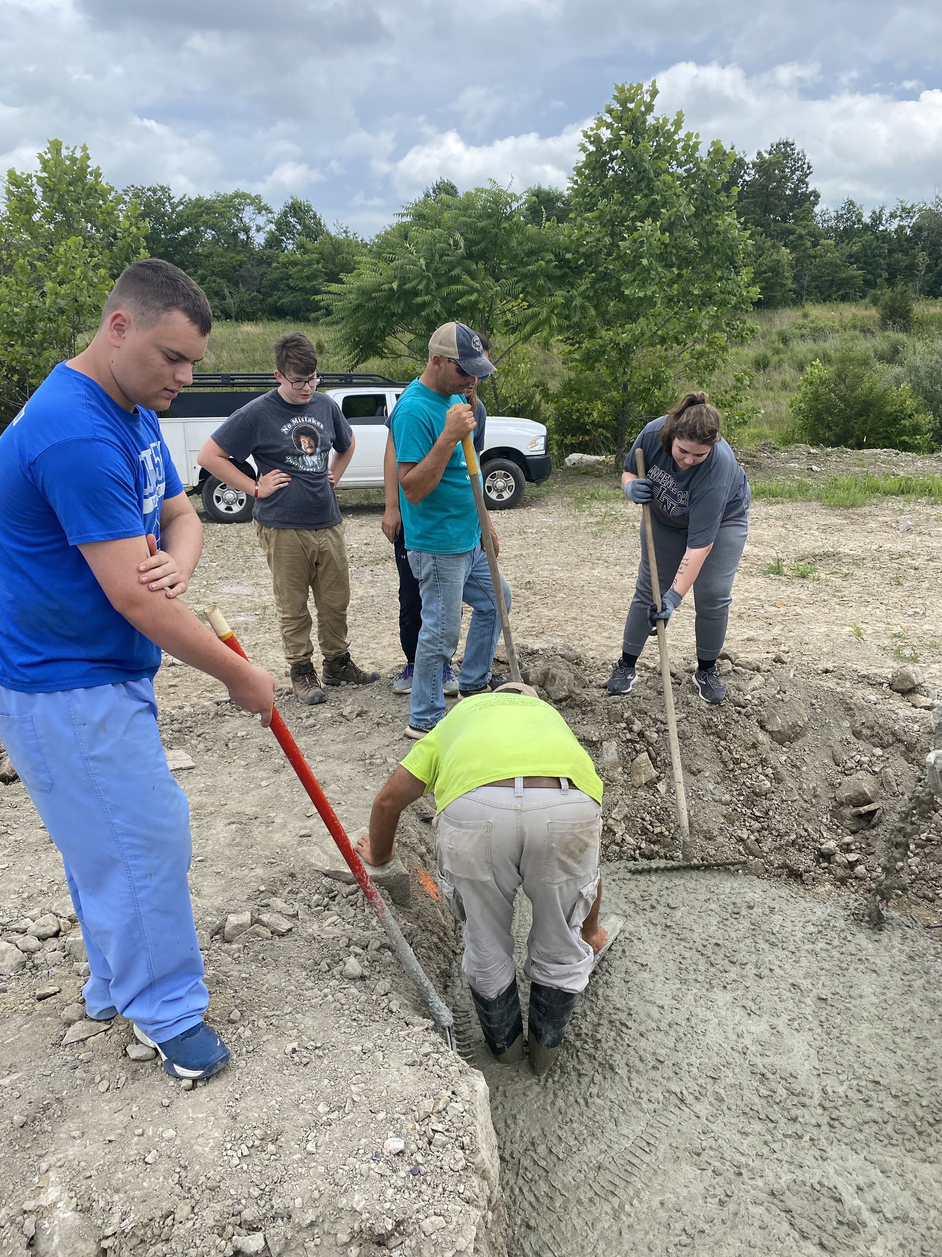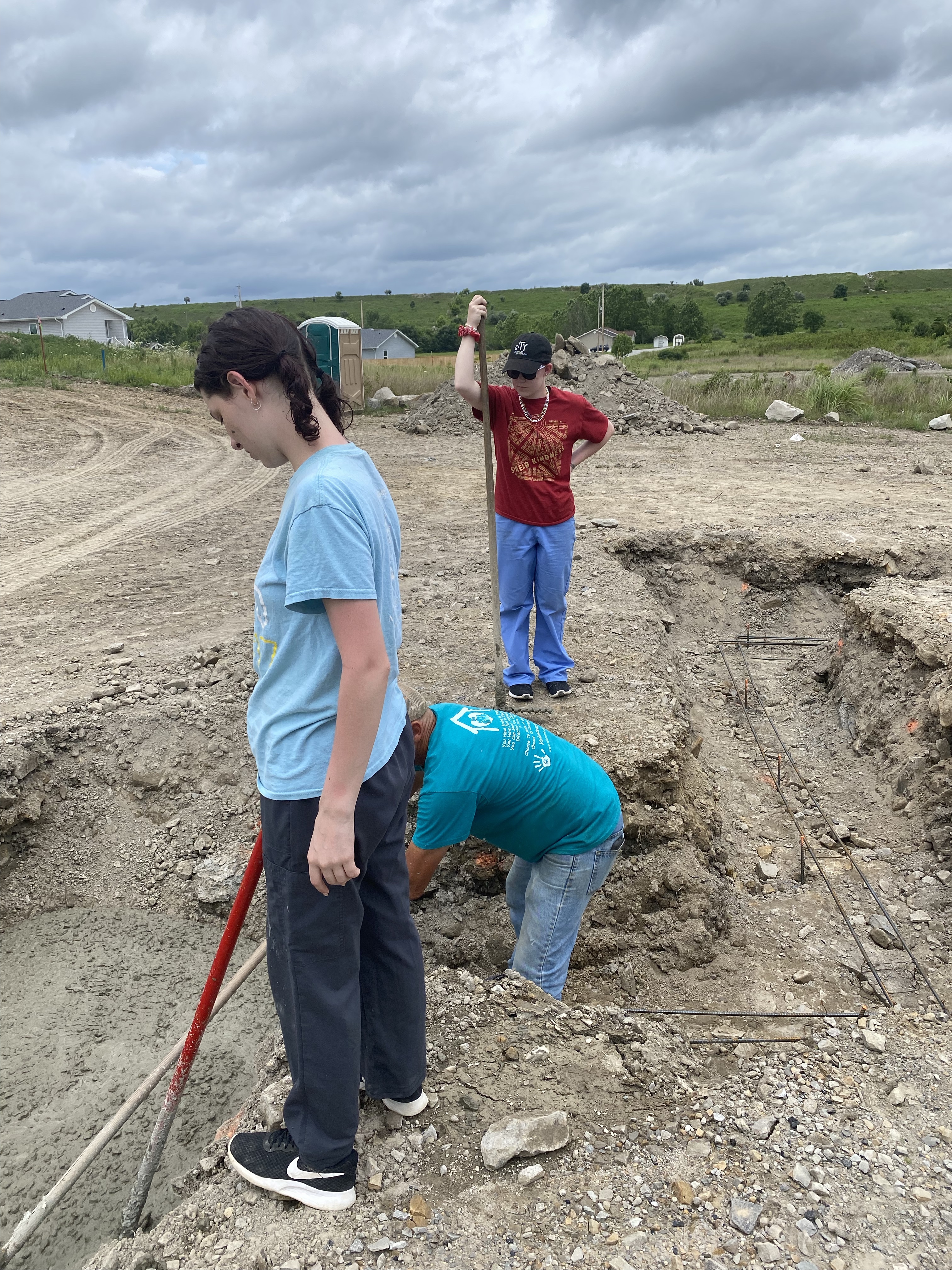 Hi, my name is Caroline Driskell and I was in group B. I am a graduated senior; this is my sixth mission trip with GCC and my second mission trip to Hazard. Today my group worked with the contractors to survey the lot and build the foundation for what will eventually be a new home in an area that has not had new developments for ten years. As the contractors dug out dirt to create the foundation, we helped make sure that everything was level, then we added reinforcements and helped spread concrete. One of the best parts of our day was talking to the contractors at our worksite and getting to know each other. The contractors were even nice enough to let us try using the backhoe during our down time, which almost made up for our 5:15 am wake up. All in all, we had a good first day and we feel ready to take on the rest of the week!